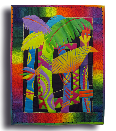 Hand dyed cottons, silks, and cheesecloth, hand embroidery, sequins, thread schnibbles, fused and machine and hand quilted. 21x15” $250