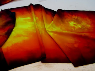 I am in the process of washing out what I dyed yesterday. It was an especially hot and muggy day and I did not want to be outside doing anything, but there was dye to use up and so I made myself do the work. So glad I did. There are four layers on each of these platters, with the top layer being the one that absorbs the excess water/dye. Since the sun was blazing (between rain showers) the platters came off the shelves and onto the driveway.