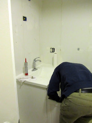 The drawers are about to be re-installed. I love this sink, which is sooooooo white, and not scratched like the former sink. The previous owner used a razor to shave with, you could tell by the scratches near the drain. He must have filled the sink with water and as he shaved would rinse off his razor in the water, leaving a scratch each time. Over the years the scratches collected ick, and it was only possible to remove by bleaching , again and again. No one will be using a razor in this white beauty.