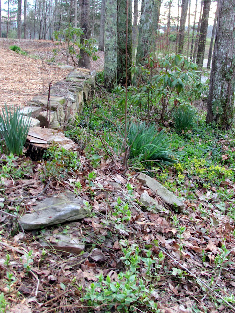 The before picture of the shade garden wall and the after or mid-after shot since the true after comes when the new wall is built. The former wall had a curve to avoid the tree, now a stump, but the new wall will not have to deal with the trees, as they are coming down. The trees are way too close to the house, as is clearly evident whenever we have a storm with high winds. Since moving here, several trees which looked totally healthy toppled over, warning us each time to count our lucky stars that nothing or no one was hurt...unless you count electrical wires.
