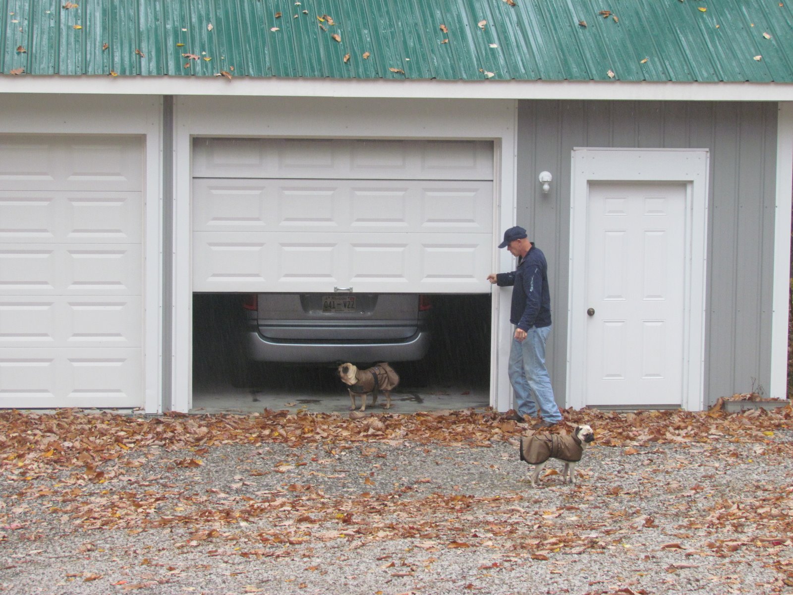 Dave is in the garage calling, but the long walk in the rain will be the trial. Chester the elder takes the plunge as Dave calls and calls.