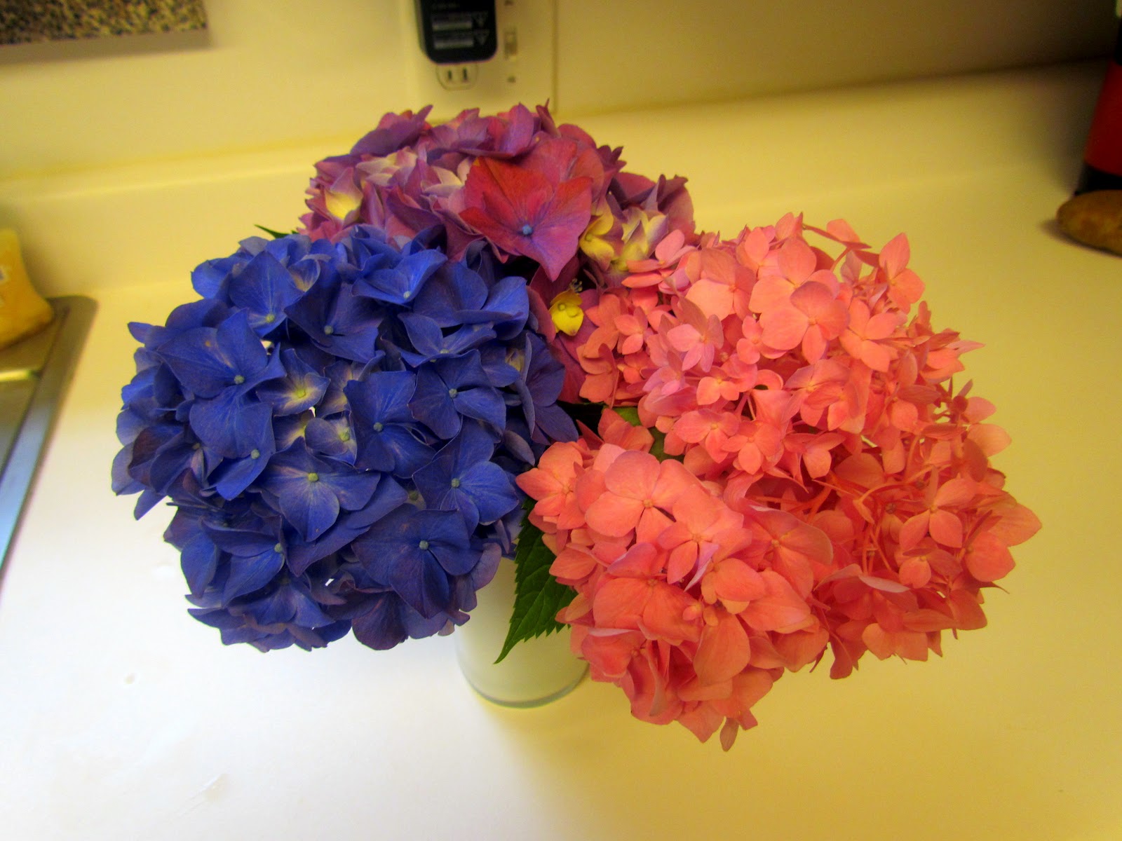I brought in some hydrangea to enjoy the color without getting wet. The blue is really dark purple, but you get the idea. The pink came from a different bush.