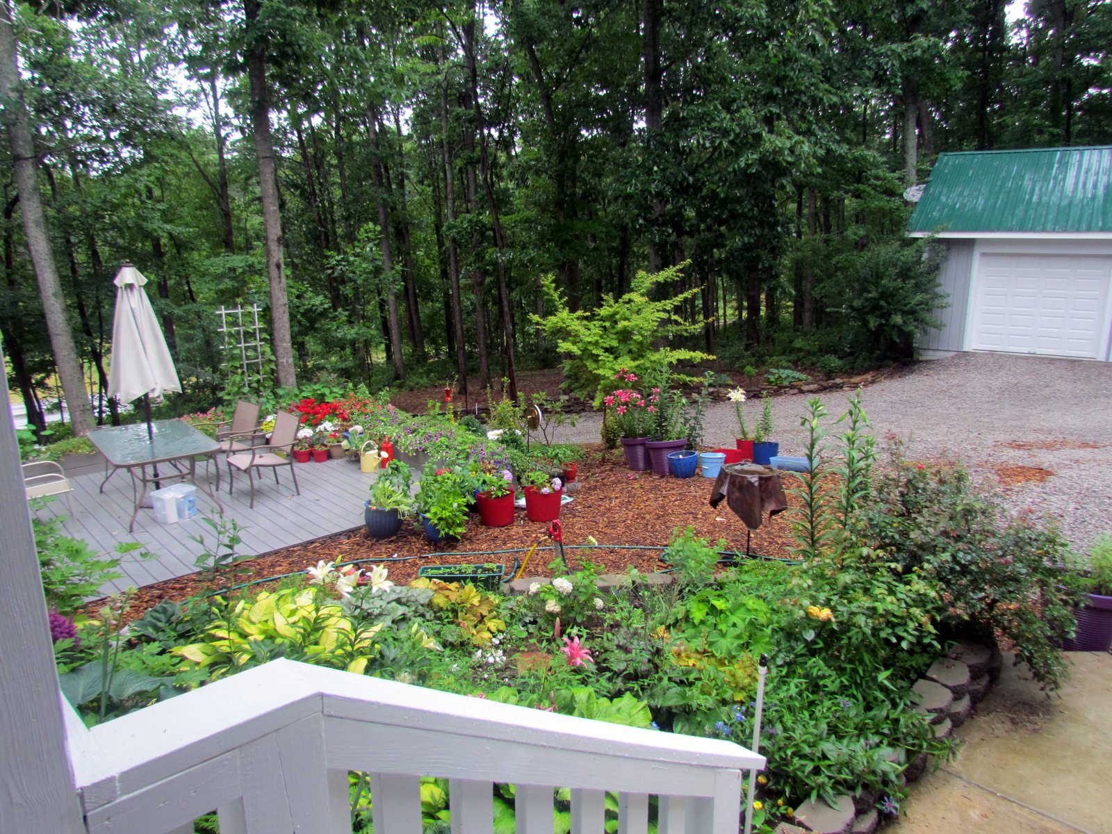 If it would only rain long enough to fill the pond with brand new water for the fishies and froggies. Can you see the hose on the bottom right? Dave has been filling the pond with our well water, a little bit everyday. I call it recycling.