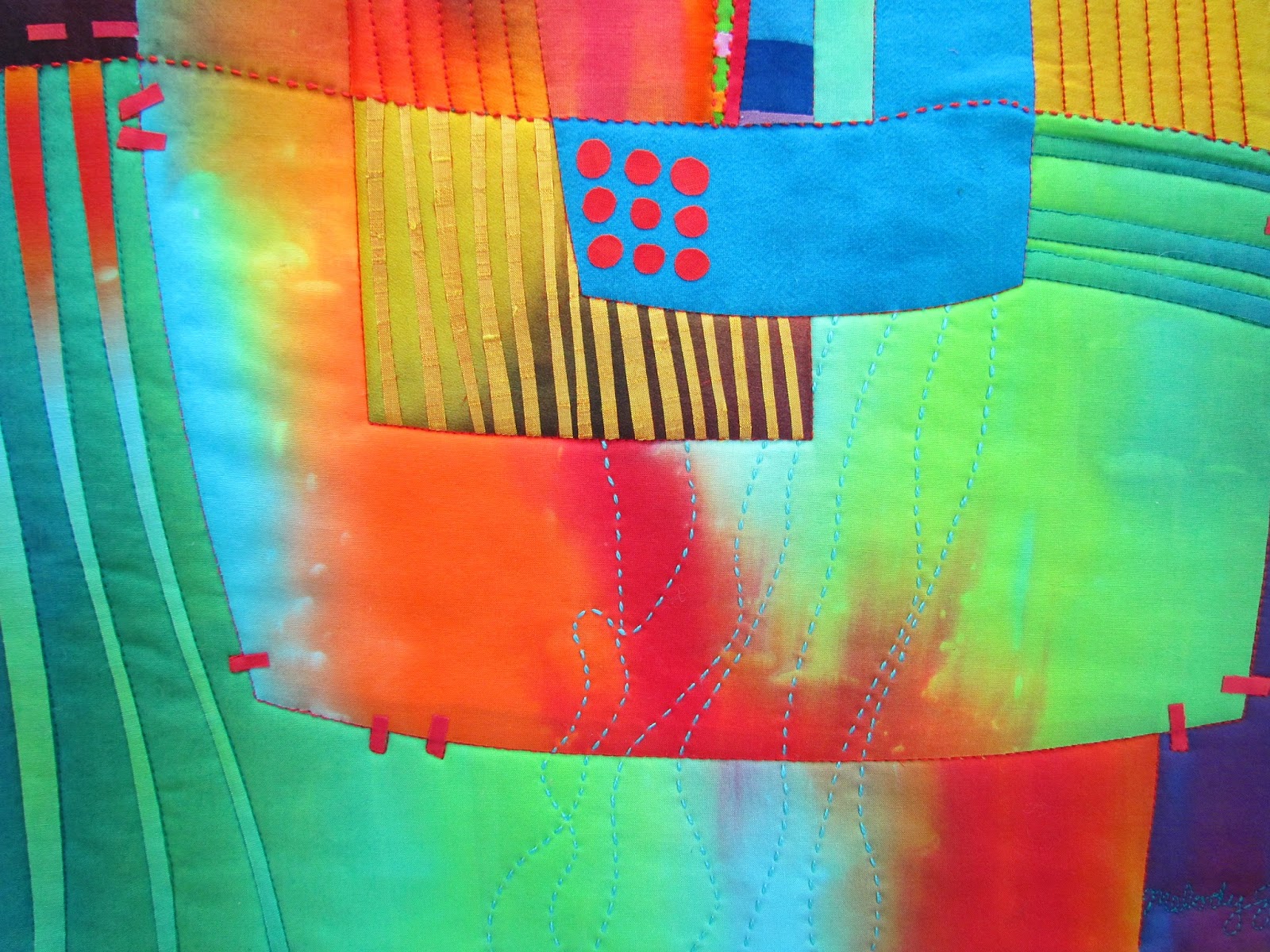Hand dyed and commercial silks and cottons, fused, hand embroidered, machine quilted. 20x18" $250 Email me.